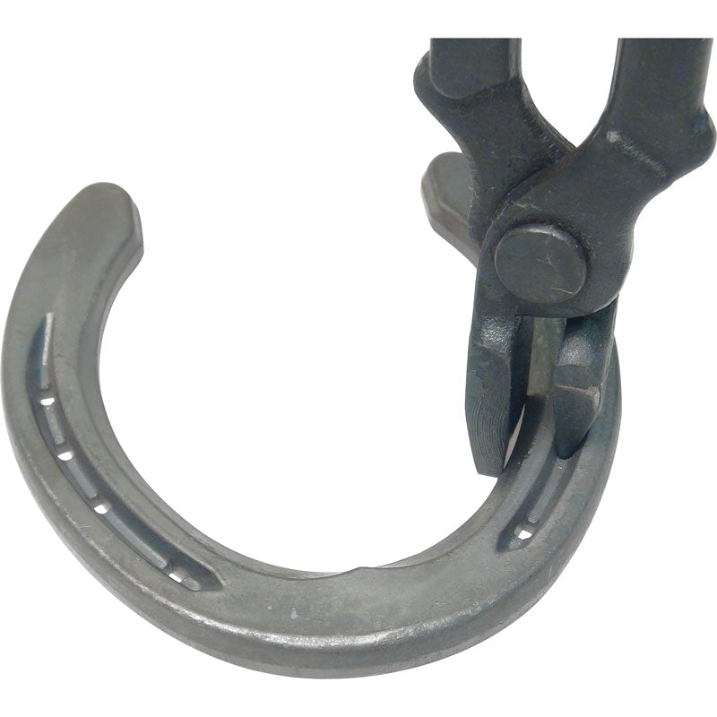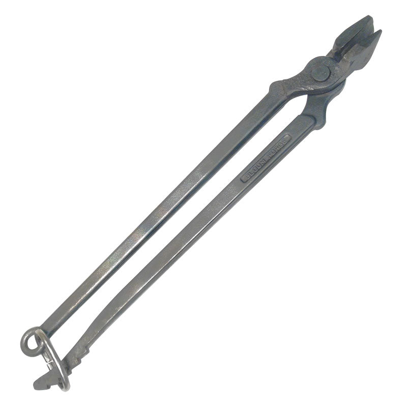 The Bloom Forge Hot Fit Lock Tong has a ring at the rein end to lock the tong reins together when on a shoe. This allows the user to check the fit of the shoe and set the shoe and tong down without losing the grip on the shoe. The tong end is set for 5/16" stock so it can be used as a fire tong if desired when shaping and modifying shoes.